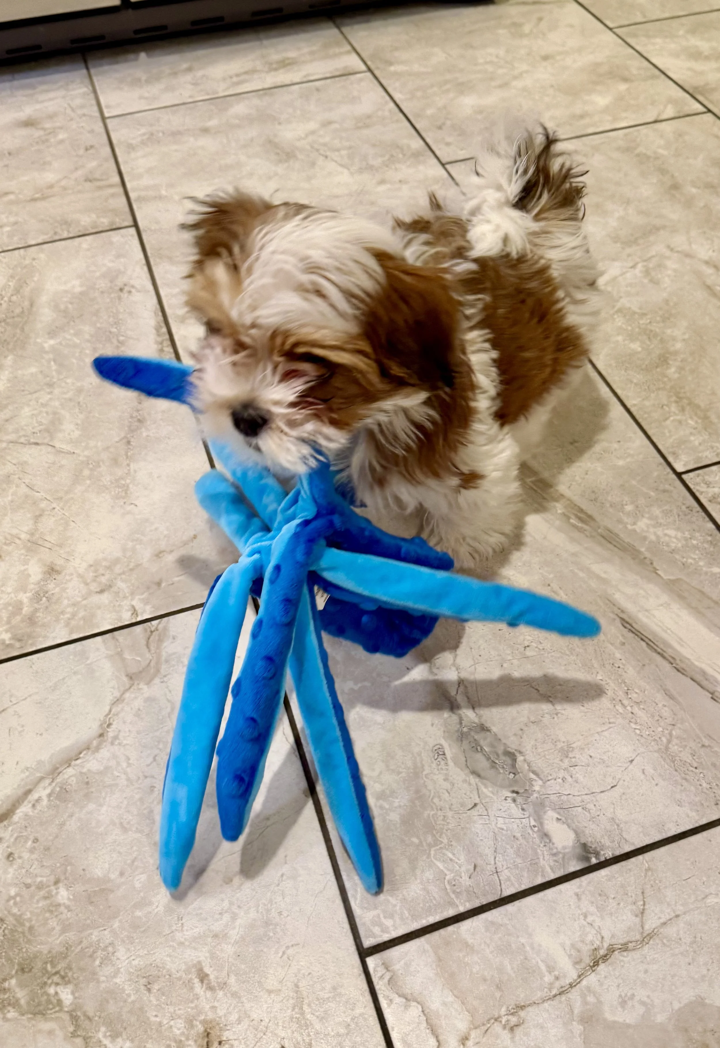 I Know it’s been a couple of weeks since my last blog. It has been busy here, I was also not well for part of the time, and my hands were too stiff for much typing. But Nutmeg still got what she needed! The weather got MUCH colder and it snowed so most of our play time has been in the kitchen. We got three of these octopuses in a package from Amazon… which was a good thing, because they have been a big hit with the entire family!!! Ducky, in particular, absolutely loves them, and wants to carry them up to bed with him!