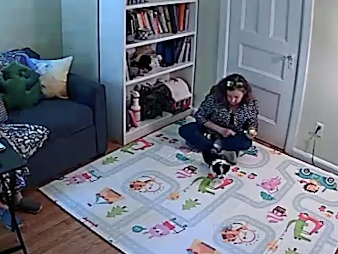 During the sixth week… We have introduced the activity box, from which hangs all sorts of different things that click, clatter, ring, or can be tugged on. Those get changed regularly too. Mom Panda is still playing with her kids a lot. Not all moms do. Some have totally jumped ship by this stage.
